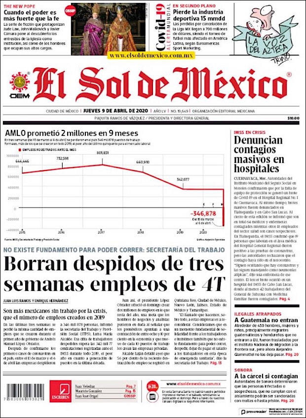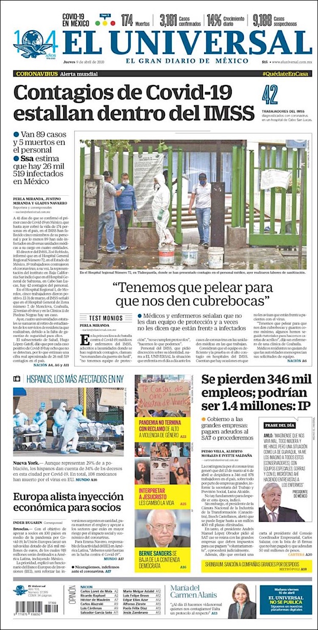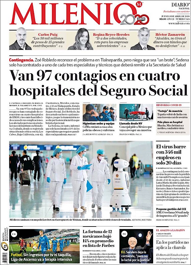 PRIMERAS PLANAS EN MEXICO DEL 9 DE ABRIL DE 2020 Publicado porNotimexpr9 abril, 2020Publicado en Nacional, Sin categoría Compártelo:TweetMe gusta Cargando... Relacionado