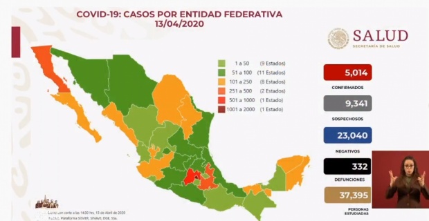Este lunes, la Secretaría de Salud, durante su conferencia vespertina, confirmó 332 defunciones y cinco mil 14 casos positivos de coronavirus.