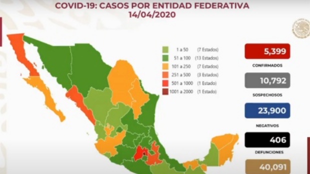 La Secretaría de Salud (SSa) anunció, en su conferencia de prensa diaria en Palacio Nacional, que hasta el momento van 5,399 de coronavirus confirmados en México, así como 406 decesos relacionados a esa enfermedad. El día de ayer, la autoridad sanitaria reportó 5,014 casos y 332 muertes, lo que quiere decir que hubo un incremento de 385 y 74 respectivamente en 254 horas.