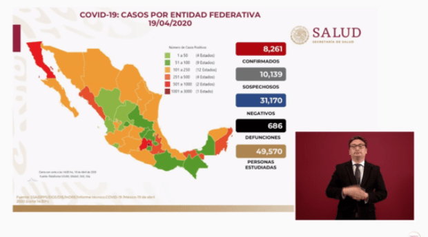 Durante la conferencia de prensa vespertina del domingo 19 de abril, la Secretaría de Salud (SSa) confirmó que en México ya son 686 las muertes por coronavirus, así como 8,261 casos confirmados.