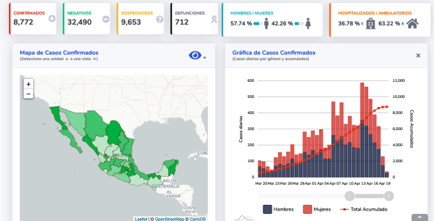 Con esos contagios México llegó a 8,772 casos positivos de Covid-19. Y a 712 defunciones.