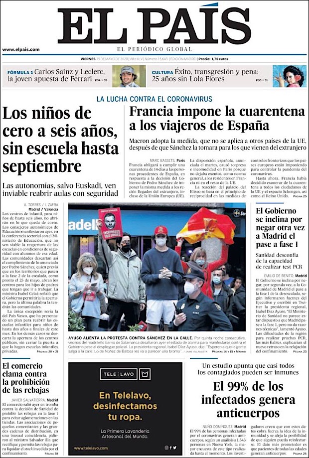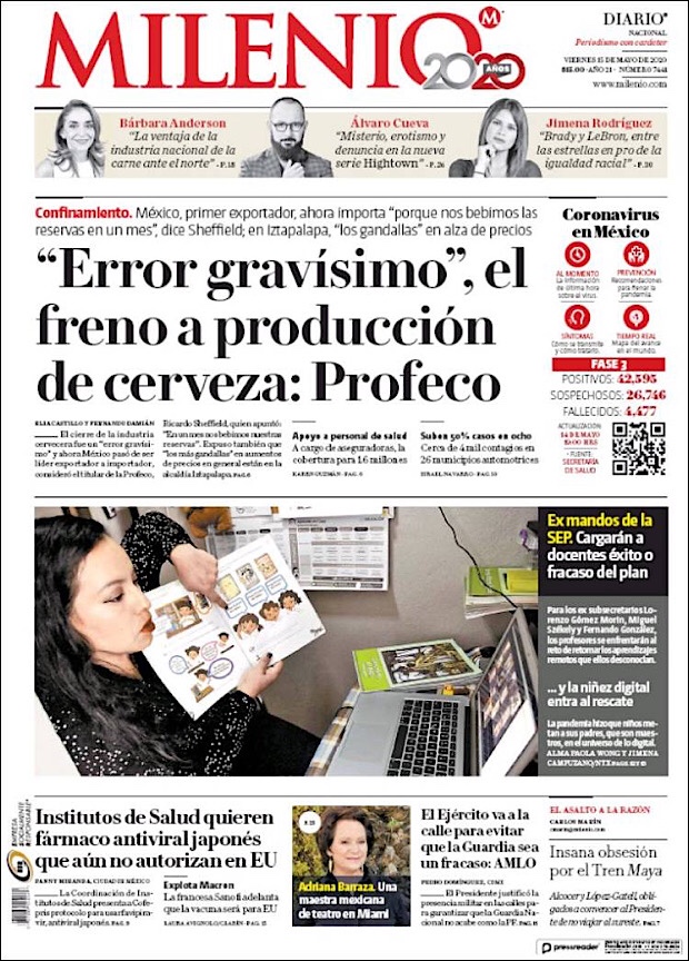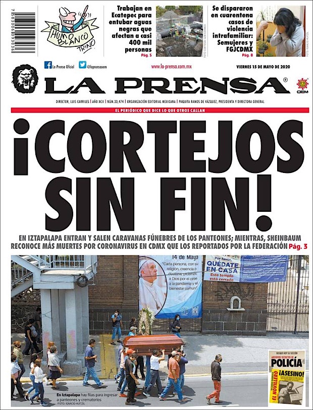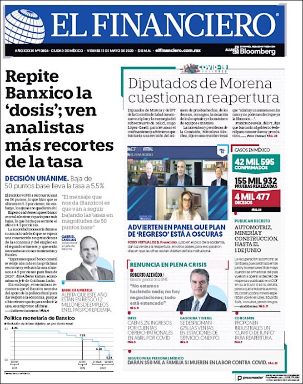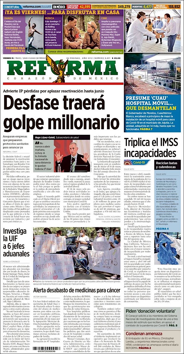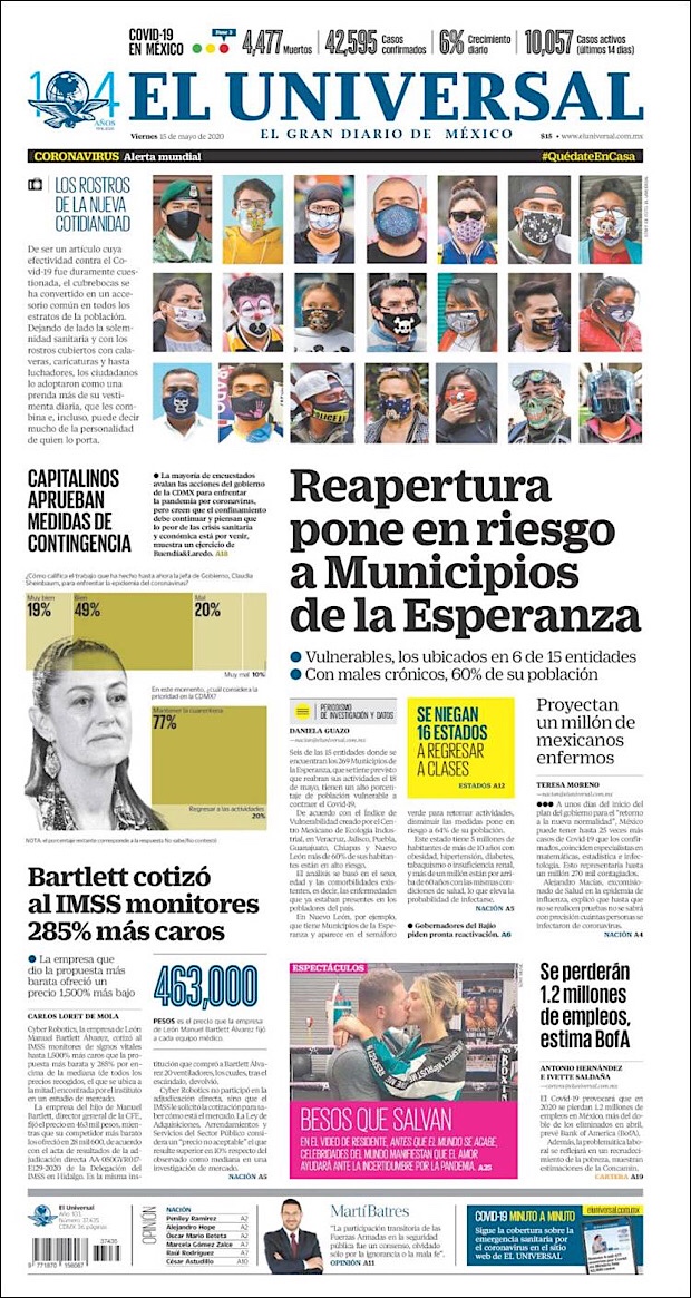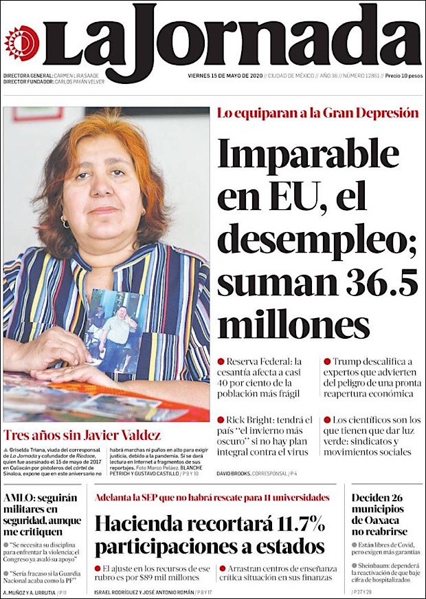 PRIMERAS PLANAS DE MEXICO Y EL MUNDO AL 15 DE MAYO DE 2020 Publicado porNotimexpr15 mayo, 2020Publicado en Nacional, Sin categoría Compártelo:TweetMe gusta Cargando... Relacionado