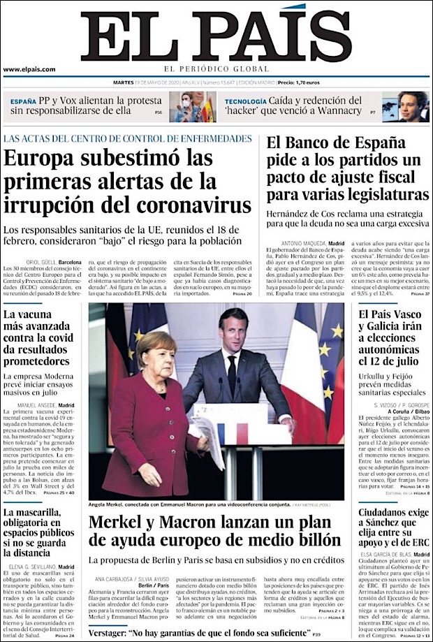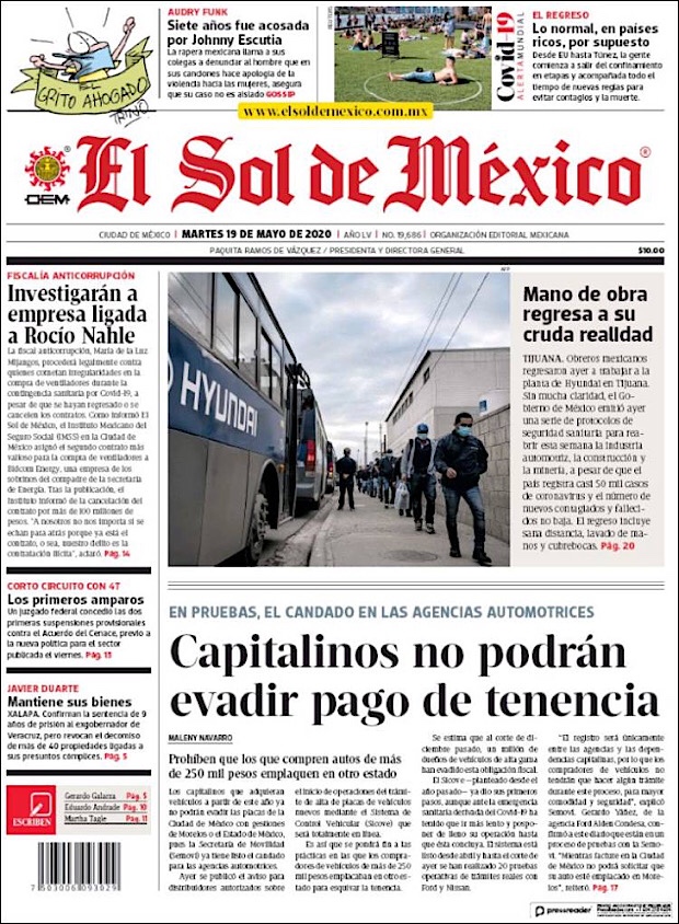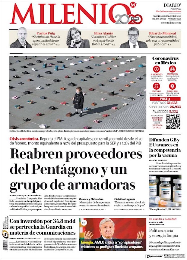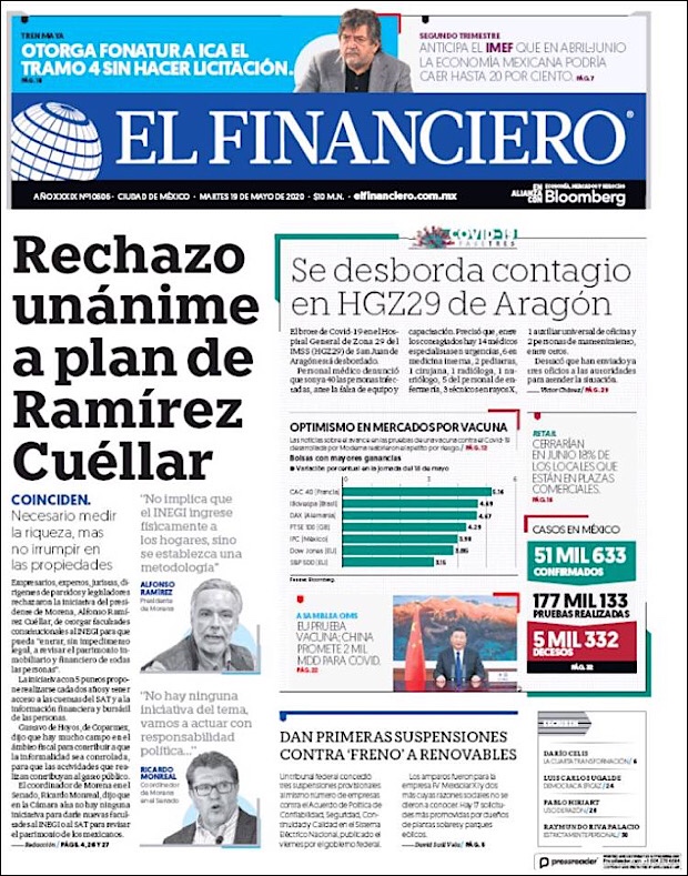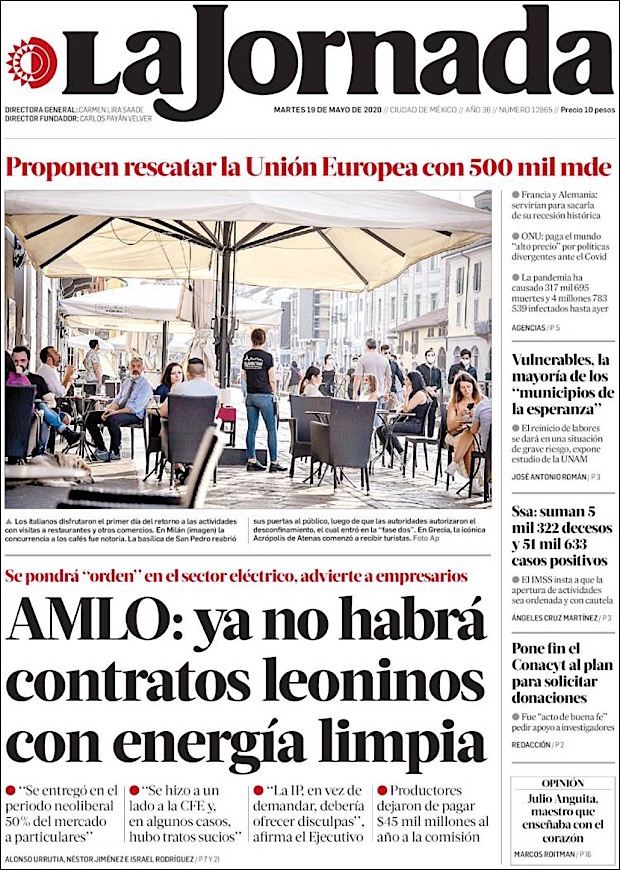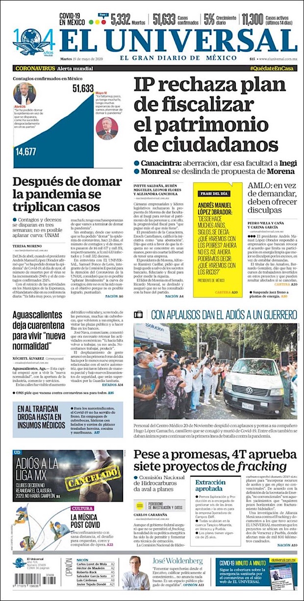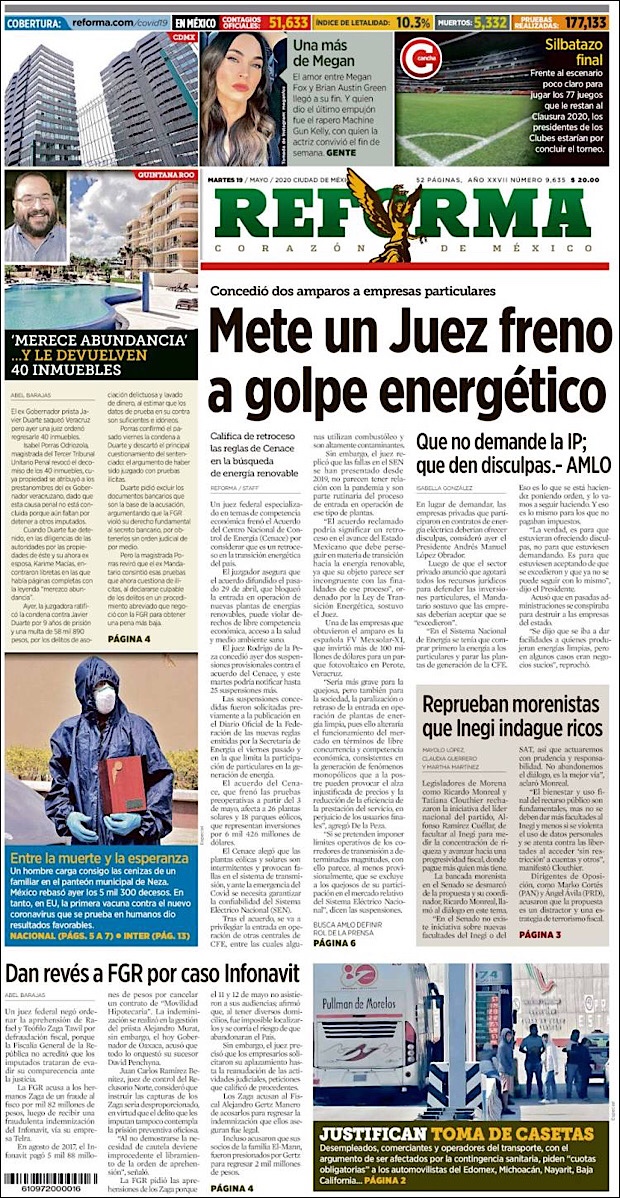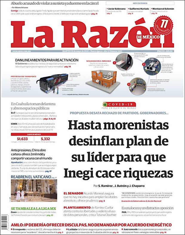 PRIMERAS PLANAS EN MEXICO Y EL MUNDO DEL 19 DE MAYO DE 2020 Publicado porNotimexpr19 mayo, 2020Publicado en Nacional, Sin categoría Compártelo:TweetMe gusta Cargando... Relacionado