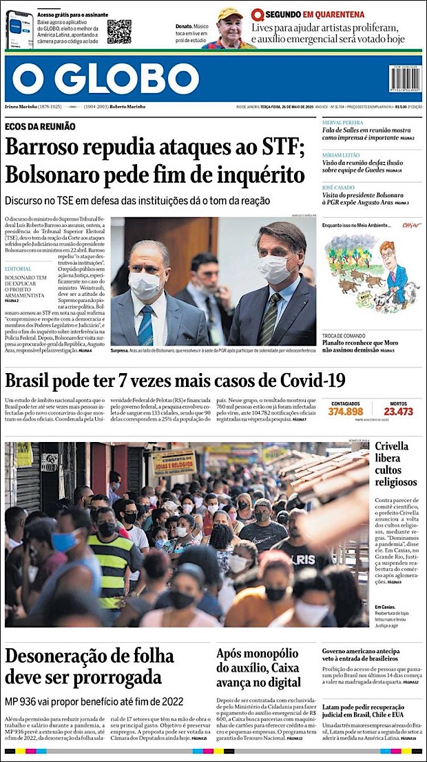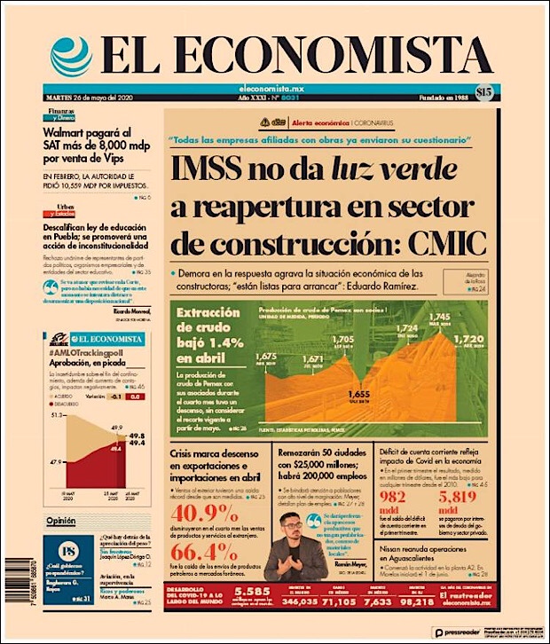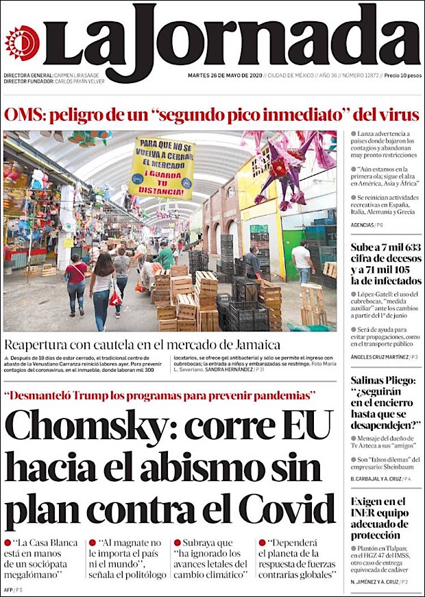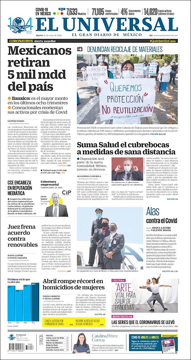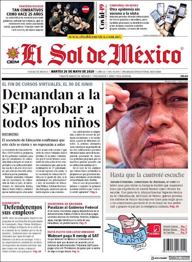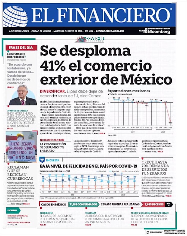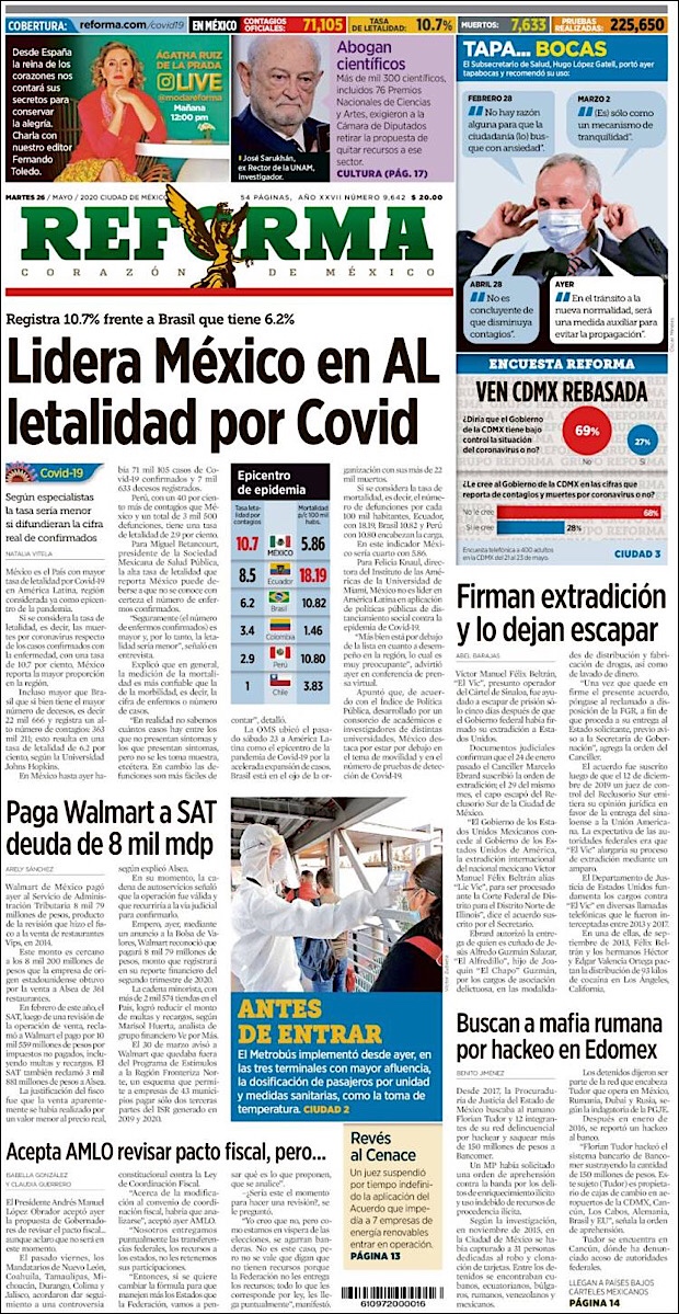 PRIMERAS PLANAS EN MEXICO Y EL MUNDO DEL 26 DE MAYO DE 2020 Publicado porNotimexpr26 mayo, 2020Publicado en Nacional, Sin categoría Compártelo:TweetMe gusta Cargando... Relacionado