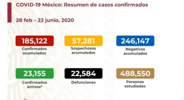 CORONAVIRUS EN MÉXICO AL 22 DE JUNIO: 22,584 MUERTOS Y 185,122 INFECTADOS