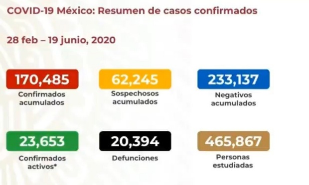 CORONAVIRUS EN MÉXICO AL 19 DE JUNIO: 20,394 MUERTOS Y 170,485 INFECTADOS
