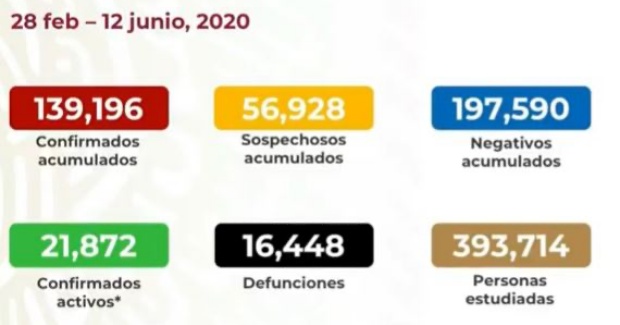CORONAVIRUS EN MÉXICO AL 12 DE JUNIO: 16,448 MUERTOS Y 139,196 INFECTADOS