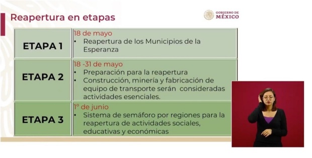 Tras 51 días de la Jornada Nacional de Sana Distancia, el Gobierno de México presentó el plan para el regreso de las actividades económicas, educativas y sociales, luego de que el país tuvo que suspender las labores por la pandemia del coronavirus. ‘El nuevo regreso a la normalidad‘ consta de tres etapas que iniciarán el próximo 18 de mayoSigue leyendo «FASES DEL REGRESO A LA NUEVA NORMALIDAD»
