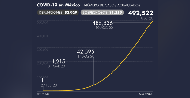CORONAVIRUS EN MÉXICO AL 11 DE AGOSTO: 53,929 MUERTOS Y 492,522 INFECTADOS