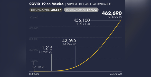 El subsecretario de Prevención y Promoción de la Salud, Hugo López-Gatell, informó que este jueves, día 68 de la Nueva Normalidad, en México suman 50,517 los decesos por coronavirus (COVID-19) y 462,690 casos confirmados acumulados.