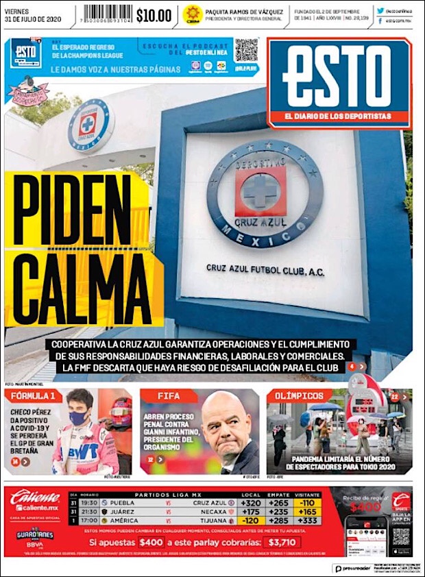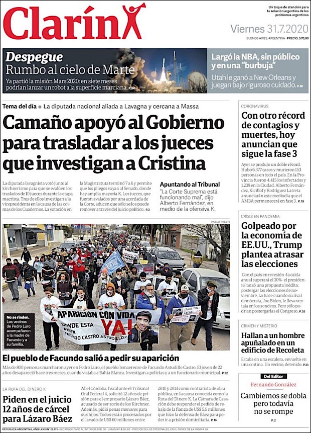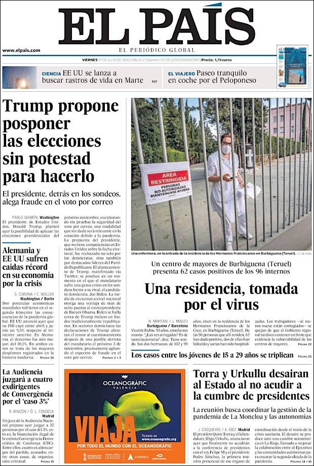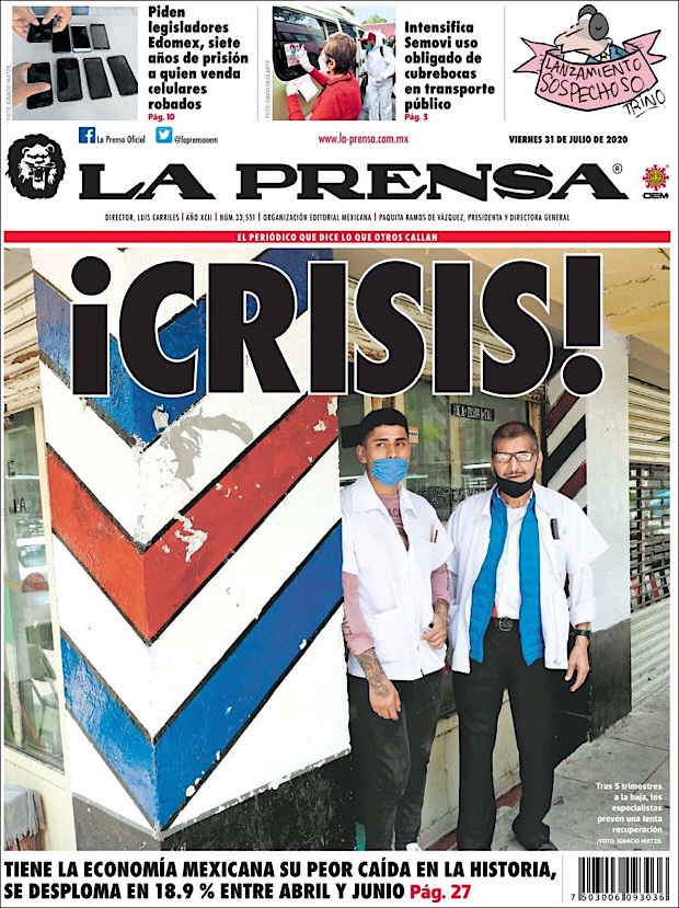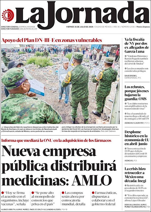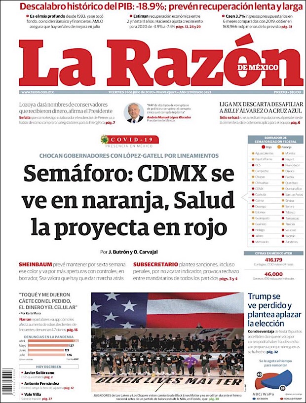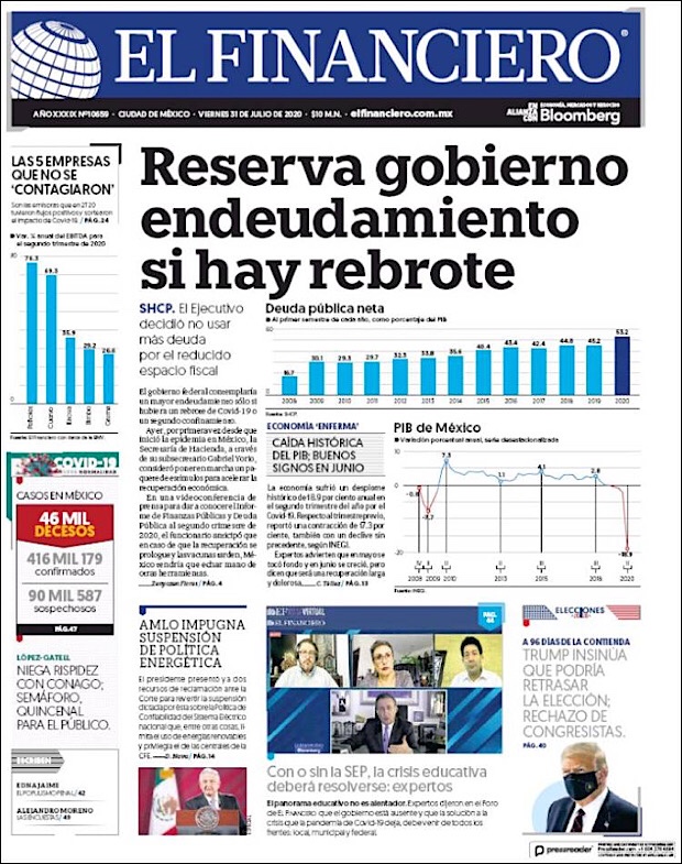 PRIMERAS PLANAS EN MEXICO Y EL MUNDO DEL 31 DE JULIO DE 2020