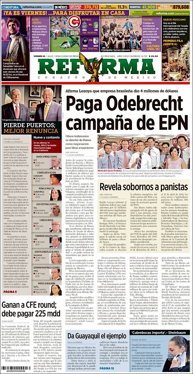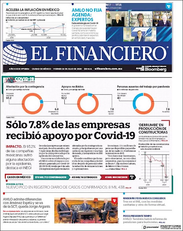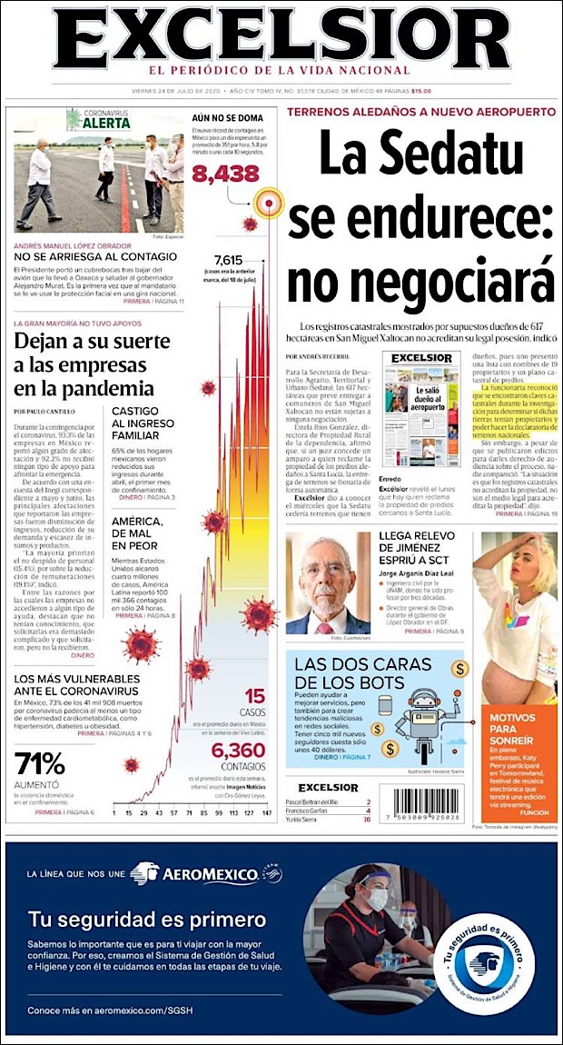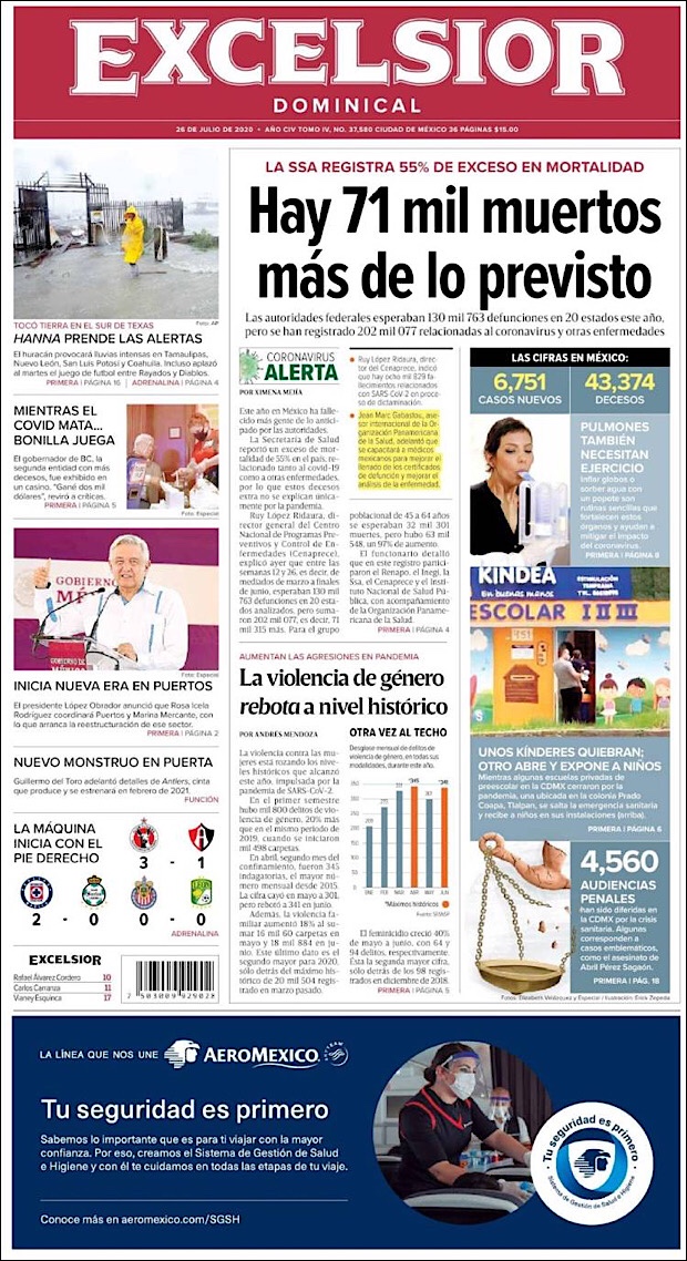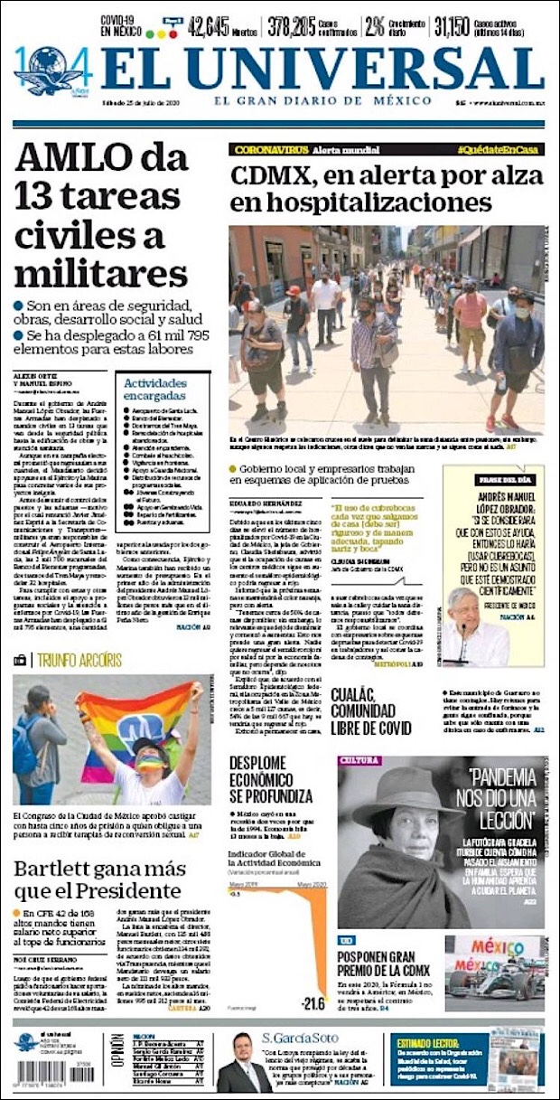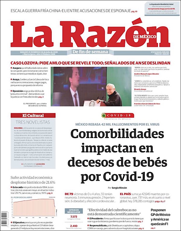 El subsecretario de Prevención y Promoción de la Salud, Hugo López-Gatell Ramírez, reportó que en este día 54 de la Nueva Normalidad, suman 42,645 decesos y 378,285 casos confirmados acumulados del nuevo coronavirus (COVID-19) en México, hasta este viernes 24 de julio.