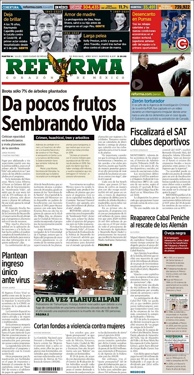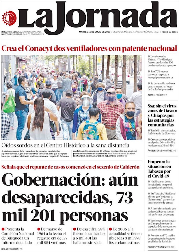 El director general de Epidemiología José Luis Alomía Zegarra, informó que al corte de este 14 de julio. Suman 36,327 decesos y 311,486 casos confirmados acumulados del nuevo coronavirus (COVID-19).