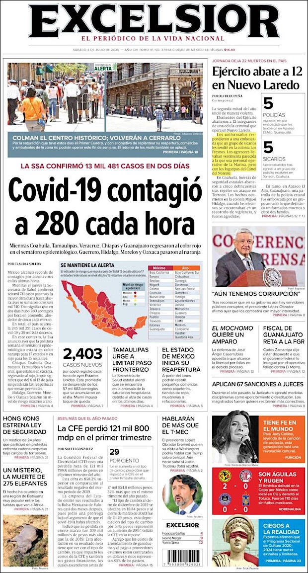 Para la semana del 29 de junio al 5 de julio, 14 entidades federativas se encuentran en semáforo rojo (estado de alerta máximo) y las 18 restantes en color naranja, lo que representa riesgo alto. El funcionario recordó que el objetivo del semáforo epidemiológico es alertar a la población sobre el nivel de riesgo de contagio que se tiene en cada momento específico.