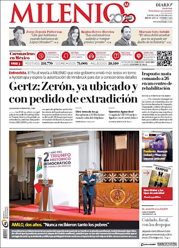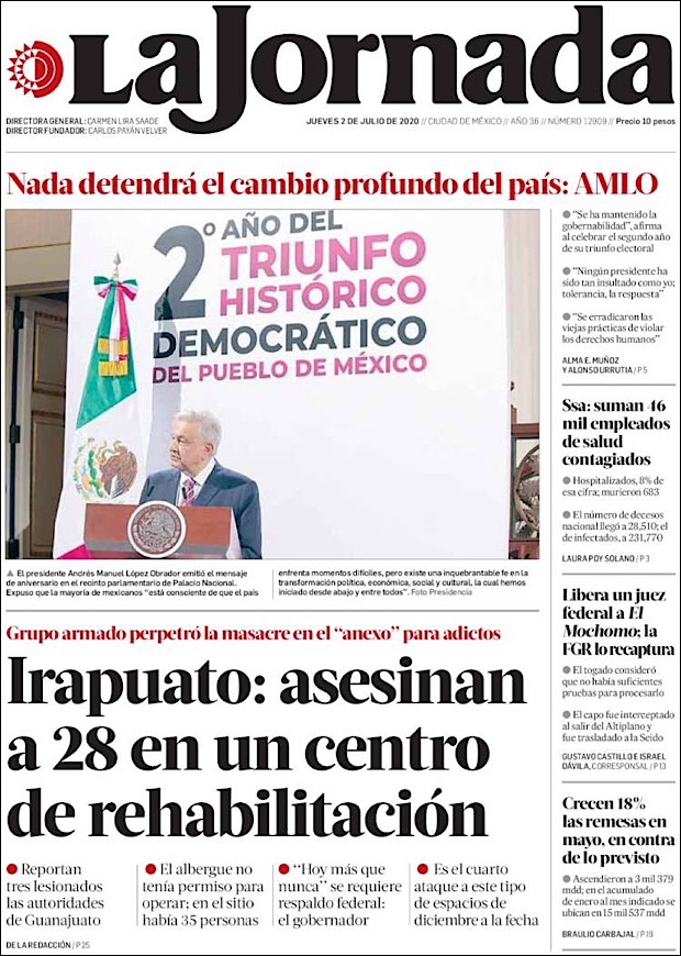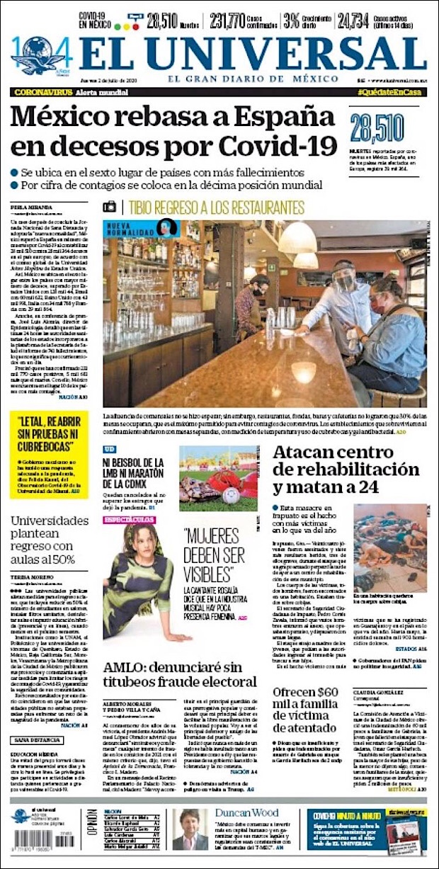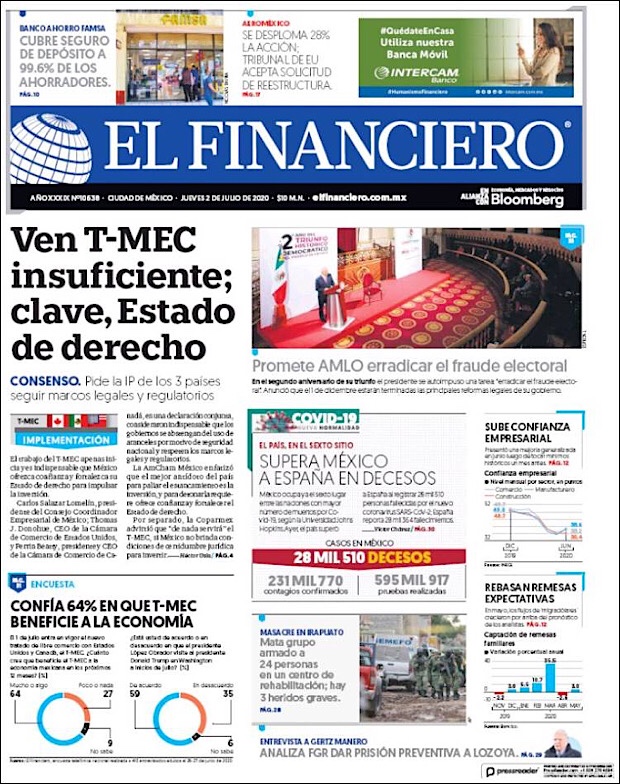 PRIMERAS PLANAS EN MEXICO Y EL MUNDO DEL 28 DE JUNIO DE 2020