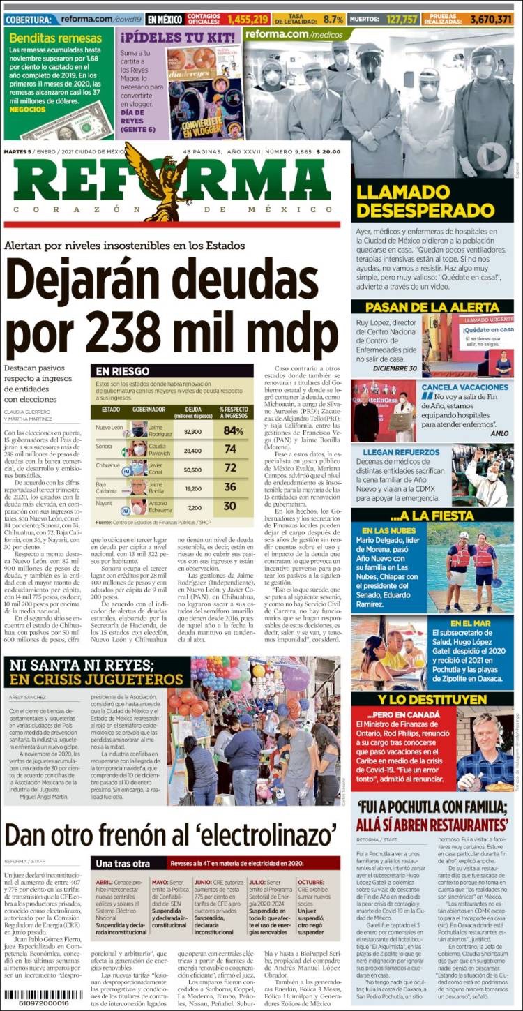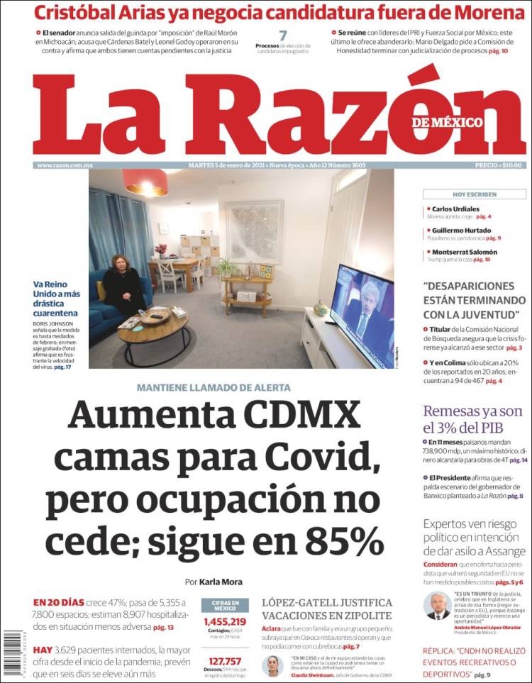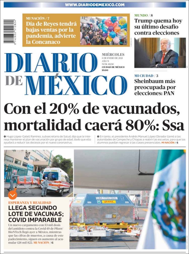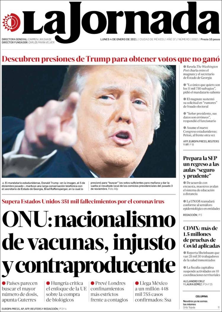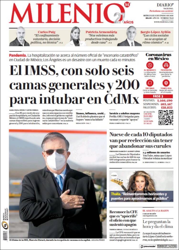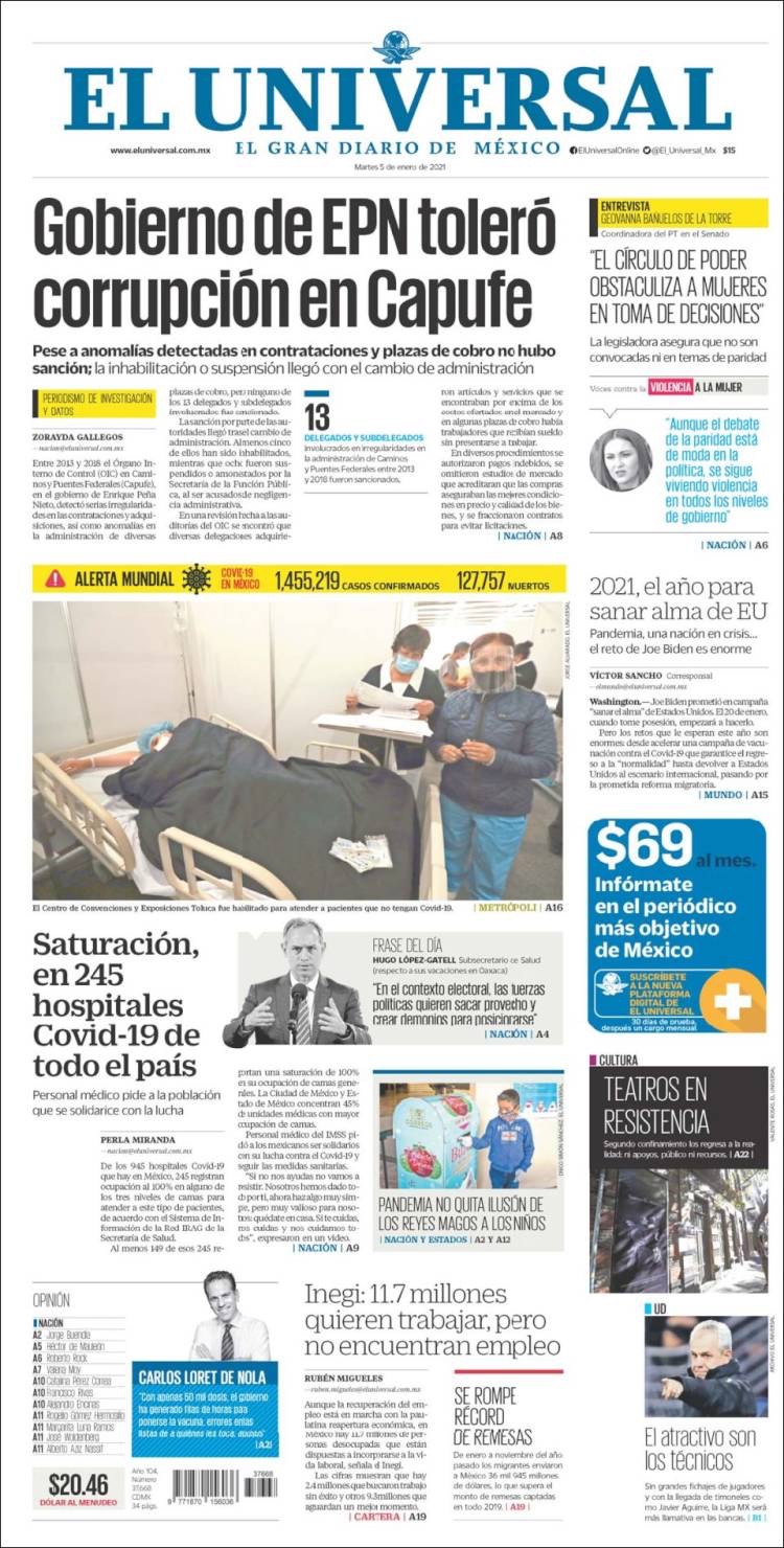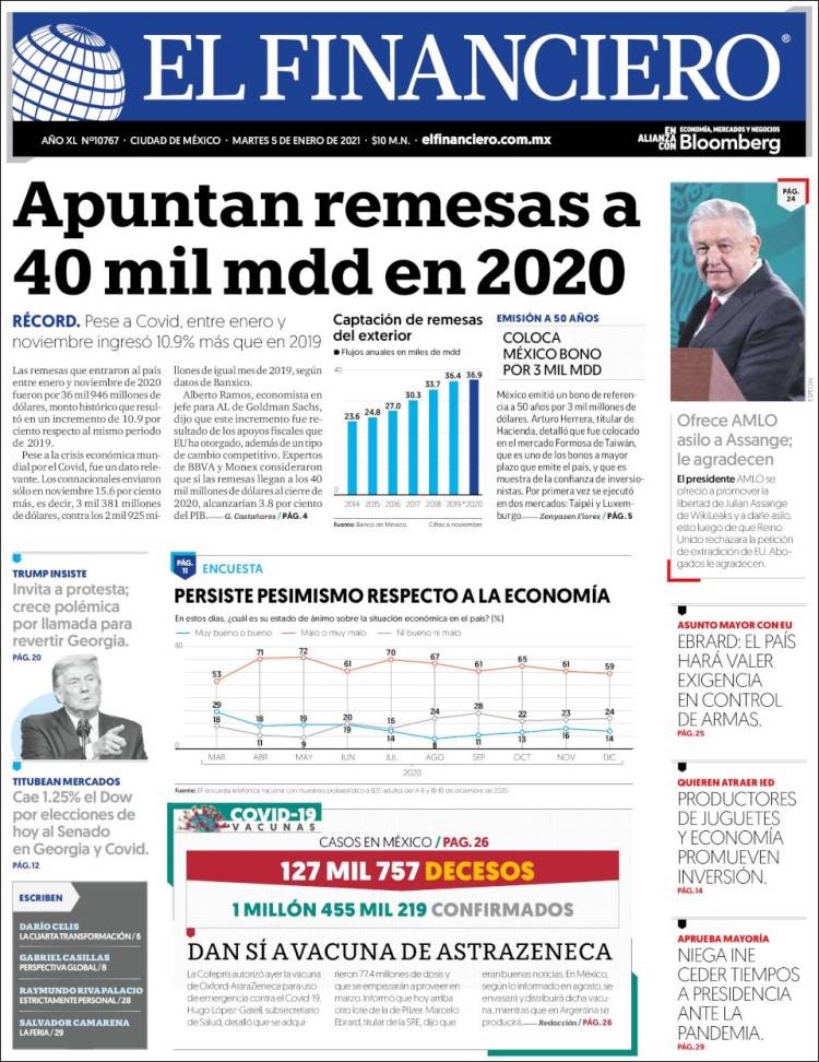 PRIMERAS PLANAS EN MEXICO Y EL MUNDO DEL MARTES 05 DE ENERO DE 2021
