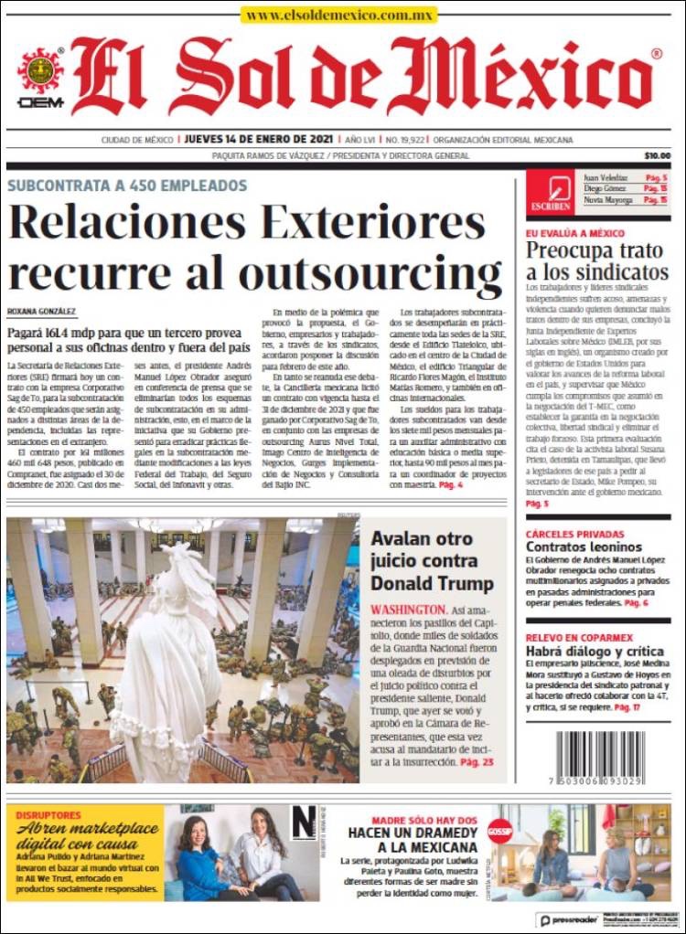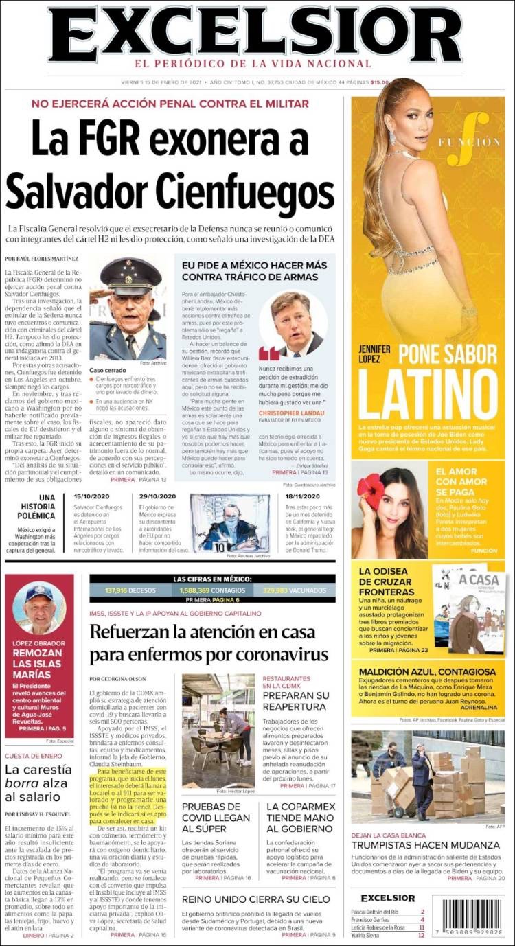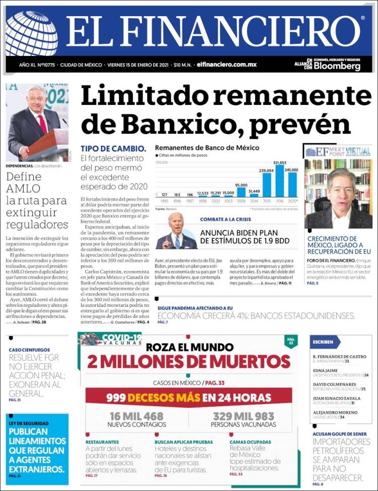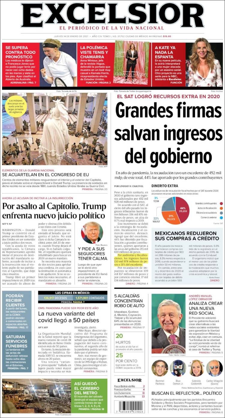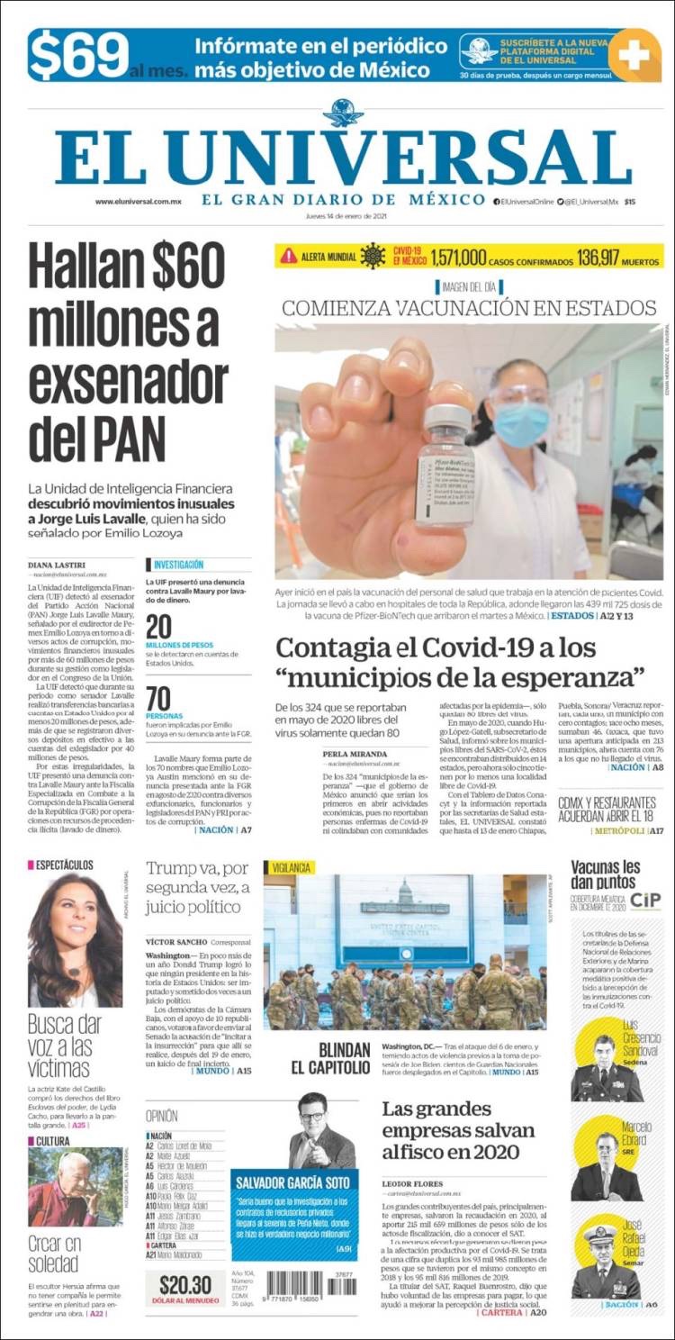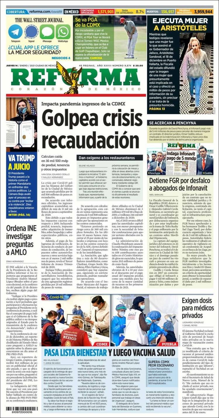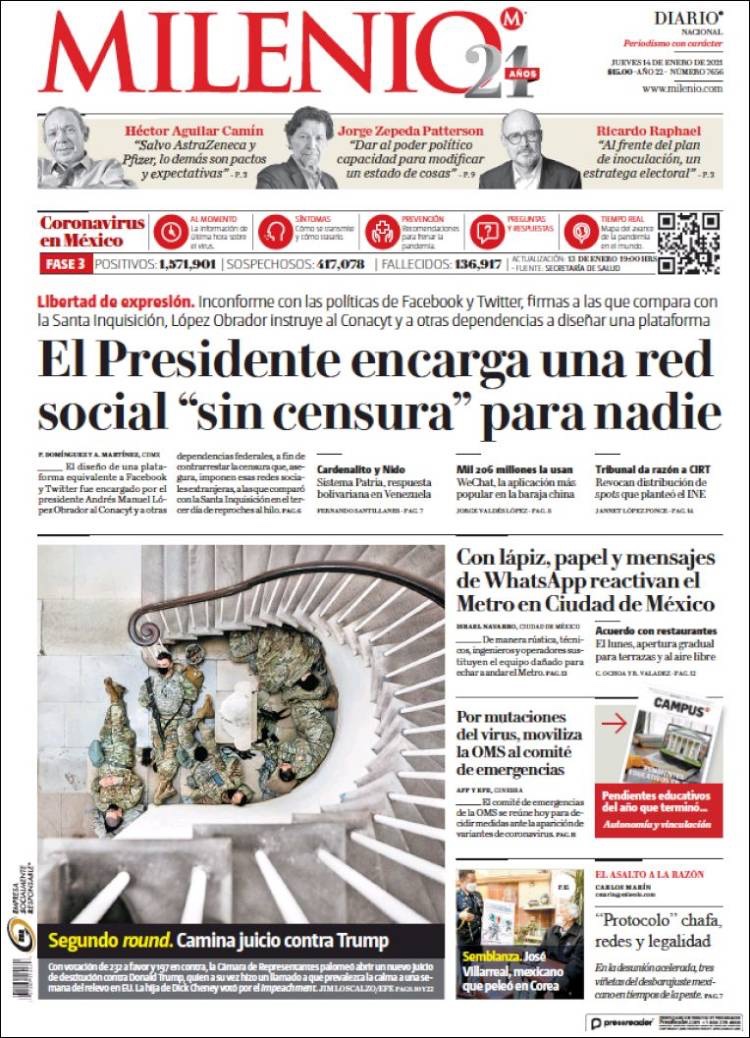 PRIMERAS PLANAS EN MEXICO Y EL MUNDO DEL 14 DE ENERO DE 2021