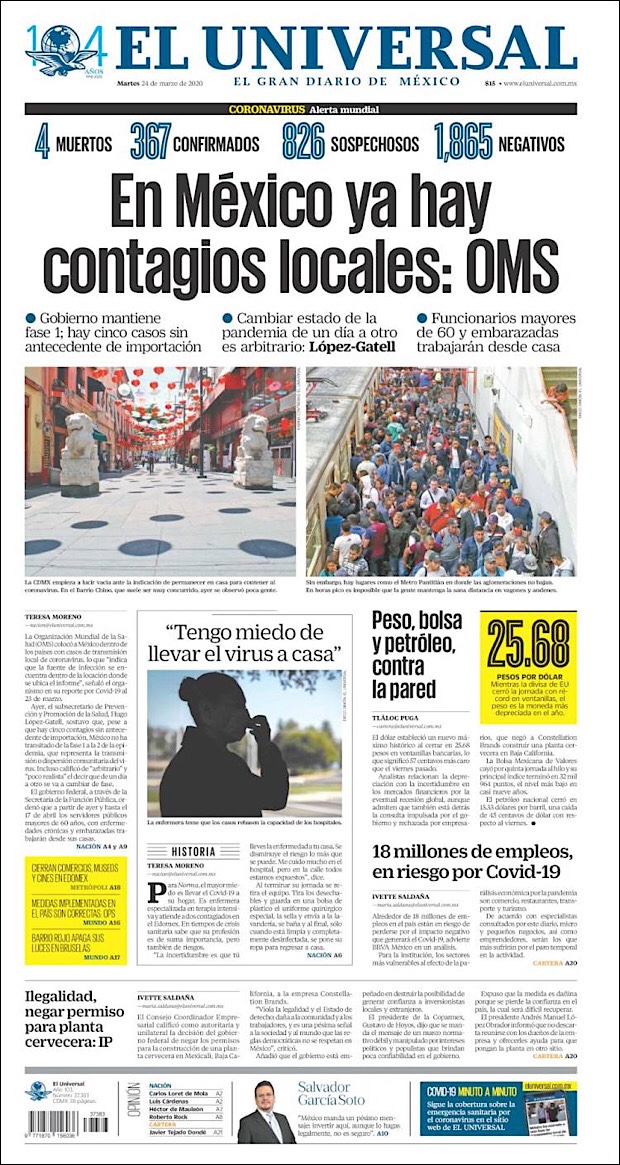 PRIMERAS PLANAS EN MEXICO DEL 25 DE MARZO DE 2020